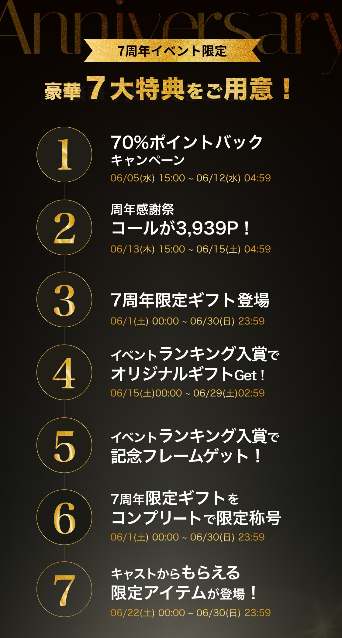対象期間中、限定ギフトのイベントを開催するとともに、キャッシュバックやpatoコールが【3,939P/h(キャスト1名分)】でご利用いただける還元キャンペーンなど、7周年にちなんで、合計7つの特典をご用意いたしました。