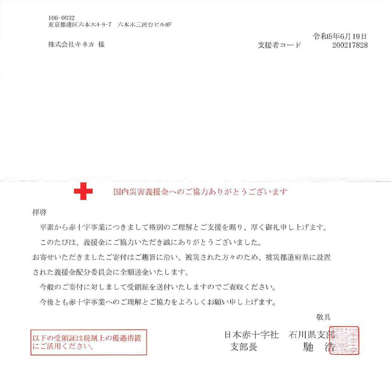 株式会社キネカは、令和5年5月能登地方地震災害義援金に寄付いたしました。