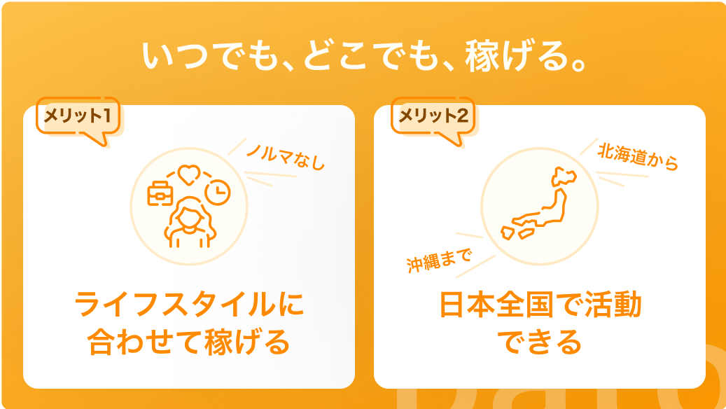 patoは24時間全国どこでも活動できるため、自分の自由なタイミングで自分らしく稼げるのが魅力です。またゴルフなどあらゆるシーンで才能やスキルを活かして報酬を得られます。