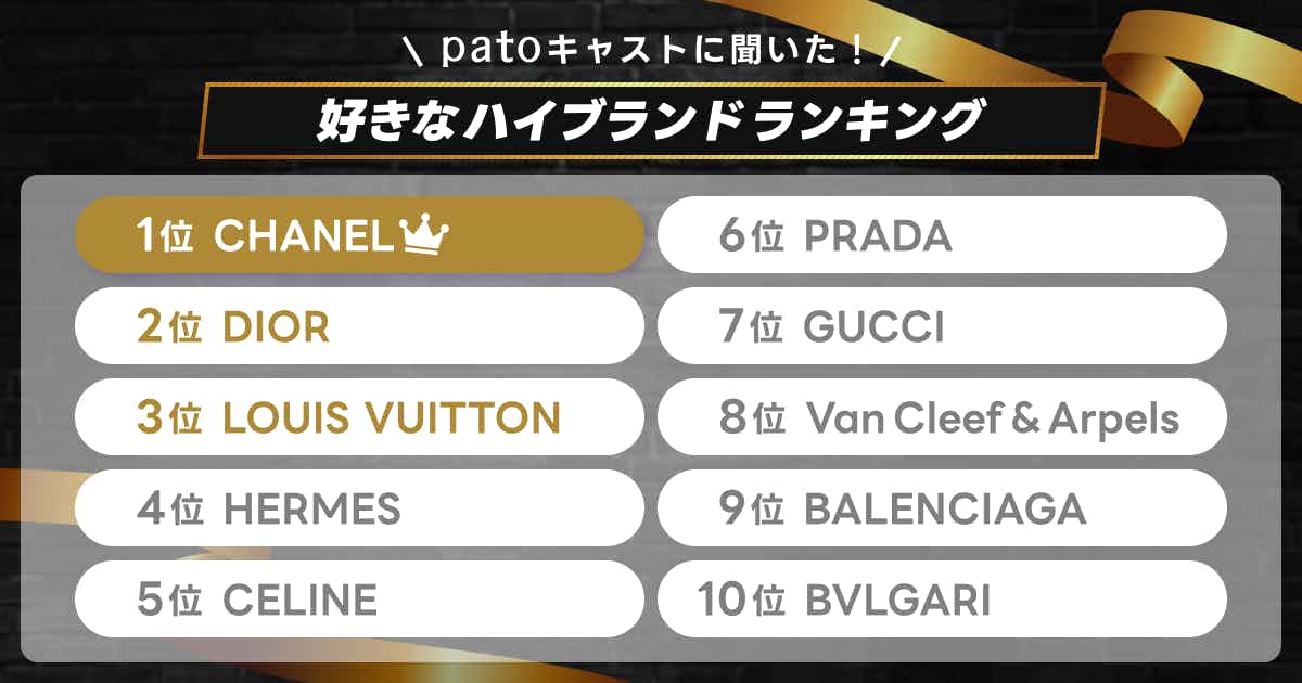patoキャストに「好きなハイブランド」をアンケートにて調査したところ、1位にランクインしたのは「CHANEL」でした。