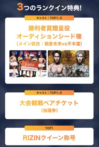 協賛に際し、patoのサービス内にて超RIZIN.3とのコラボイベントを実施し、上位にランクインしたキャストユーザーに【プレゼンターオーディション参加権】と【観戦ペアチケット】を入賞特典として付与いたしました。