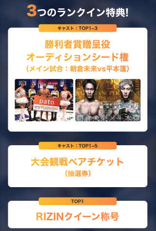 協賛に際し、patoのサービス内にて超RIZIN.3とのコラボイベントを実施し、上位にランクインしたキャストユーザーに【プレゼンターオーディション参加権】と【観戦ペアチケット】を入賞特典として付与いたしました。