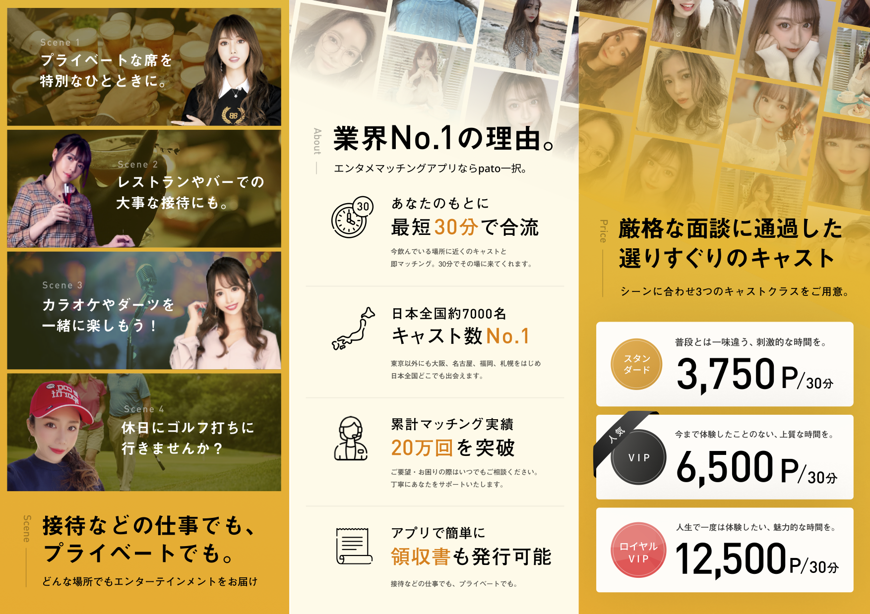 エンターテイナーと仕事を依頼したい人との特化型スキルシェアリングプラットフォームです。日本のエンターテイナーの働き方をテクノロジーによって支援し、場所や時間、旧来の業界構造に依存しない新しい働き方を実現し、世界のエンターテイナーと比較して収入・待遇面で劣ることの多い市場環境を変革していくことをビジョンに掲げています。依頼者は、"イベント"や"コンサート"の会場に出向く必要はなく、日常に溢れるレストランやカラオケ等の施設で手軽に手品やショーなどのエンターテイメントを楽しむことができます。シェアリングエコノミーの力でエンタメ産業を変革し、スキルや得意を持つキャストの新たな収益源となるエンタメ文化を創出し、生活者の"いつものシーンを非日常に"彩ることで、日本を元気にするサービスを目指していきます。2020年10月にはゴルフマッチングに特化した「パトゴルフ」の提供を開始。既存のエンタメマッチングのノウハウを活かし、ゴルフ業界全体を盛り上げていく。
