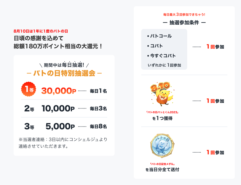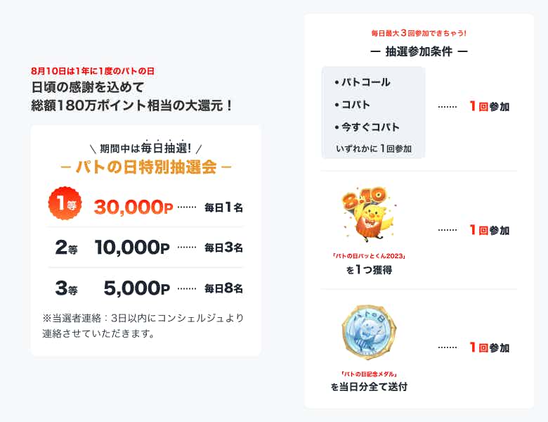 またイベント期間中にpatoコール、コパト、イベント限定ギフトをご利用いただいたユーザーを対象として、最大3万ポイント分のクーポンやポイントバック等の特典が当たる抽選を10日間毎日実施いたします。特典が獲得できる総ユーザー数としては100名以上、総額としては180万ポイント分(約200万円相当)となります。その他、詳細はサービス内にて通知いたします。
