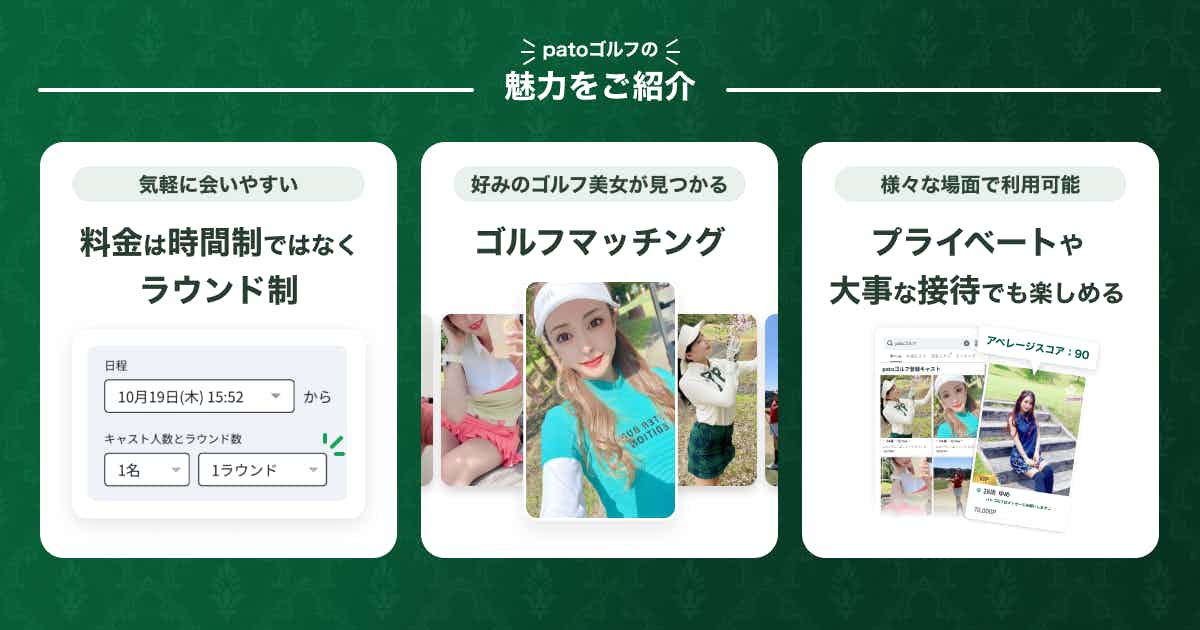 日本最大級のエンタメマッチングサービス「pato」が提供する、ゴルフ好きのゲストユーザー様とゴルフスキルを持ったキャストユーザー様をマッチングするサービスです。